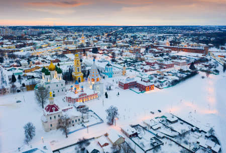 Scenic view from drone of Kolomna cityscape with architectural ensemble of ancient Kremlin on evening, Russia