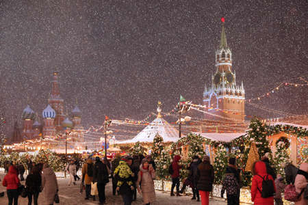 MOSCOW, RUSSIA - December 28, 2018. People walking to Saint Basil's Cathedral. Traditional New Year outdoor festival on Red square decorated with Christmas trees.