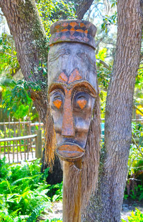 African tribal mask hanging from a tree in a local zoo, Tampa, Florida, USA.