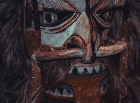 Image of an ancient primitive wooden mask surrounded by a solid wall of flame