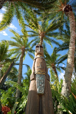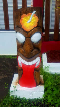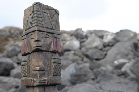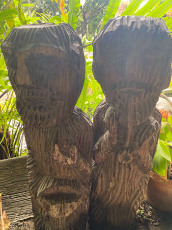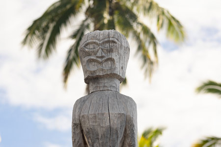 Traditional Hawaiian wood carving of guards at ancient Hawaiian site Pu'uhonua O Honaunau National Historical Park on Big Island, Hawaii