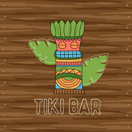 Tiki tribal wooden mask, signboard of bar. Hawaiian traditional elements on wooden background. Vector illustration.
