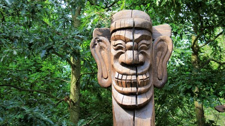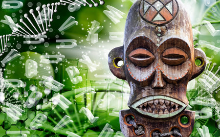 A close-up of a weathered wooden totem with a fierce expression, set against a backdrop of a vibrant green forest and abstract DNA spirals.