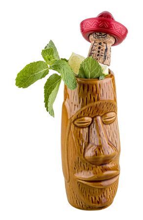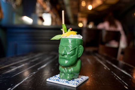 Russia, Sochi 14.03.2020. A glass of tiki with straws for cocktails stands on a counter next to a carved wooden column.