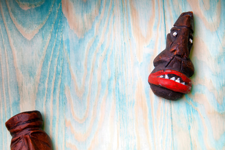 Photo of blue toned ancient wooden fantasy face idol totem laying on cracked ice surface.