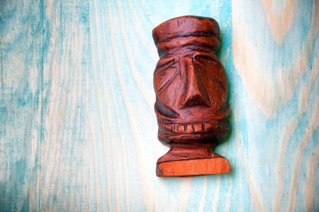 Details of a tribal object from Micronesia. Representation of a human face carved in wood.