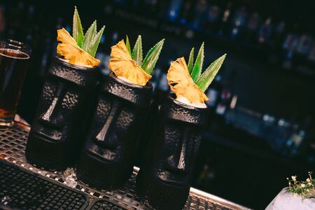 ice cold modern Cocktail gourmet craft white with Sweet caramels decoration slice Author Drink - on bar counter . Close-up Top view . Copy paste space design barman people and luxury nightclub