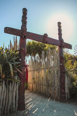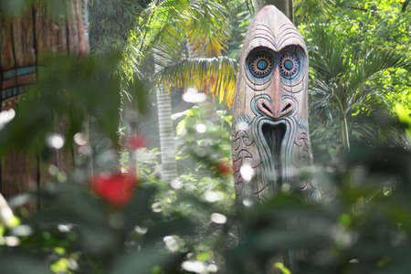 Hastings, New Zealand - January 05 2018 : The cropped shot view of the traditional Maori wood carving statue in Civic square of Hastings, New Zealand.