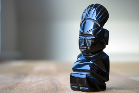 An aztec obsidian ancient statuette on wooden table in sunlight.