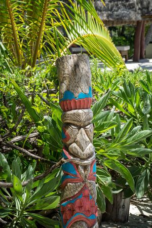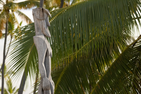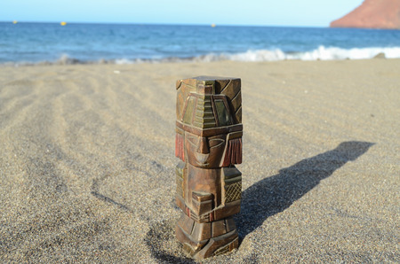 A closeup shot of a tiki statue on tropical beach sand in a studio