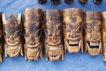 KOLKATA, WEST BENGAL , INDIA - NOVEMBER 23RD 2014 : Wooden masks of handicraft, on display during the Handicraft Fair in Kolkata. It's the biggest handicrafts fair in Asia.