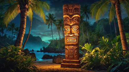 A striking tiki god statue illuminated under moonlight in a serene tropical setting, evoking a mystical atmosphere and cultural heritage. Perfect for travel or decor themes.