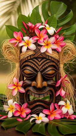 Wooden carved mask with tropical flowers on the background of palm leaves