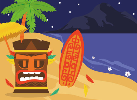 Tiki cartoon at the beach at night design of Hawaiian tropical summer and exotic theme Vector illustration