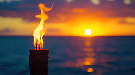 Experience the beauty of a tranquil beach sunset featuring a glowing flame torch. The gentle ocean waves and colorful sky create a perfect romantic ambiance.
