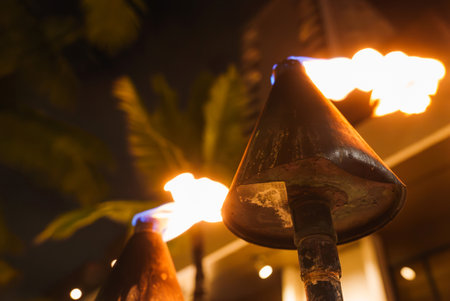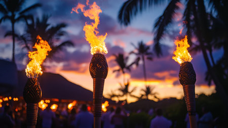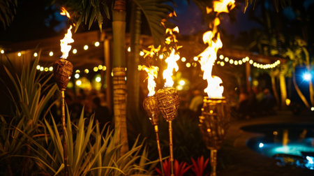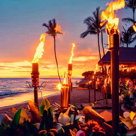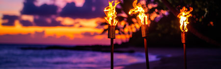Flames flicker in tiki torches at sunset creating a warm and inviting ambiance on a tropical beach