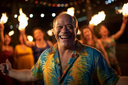 The flames of several tiki torches flicker in the background adding to the cozy and intimate atmosphere of the party. 2d flat cartoon