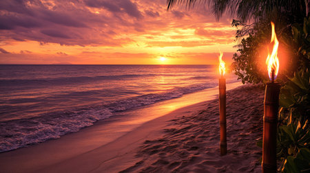Burning tiki torches lining a sandy beach, casting a warm glow and creating a magical atmosphere during sunset's enchanting moments