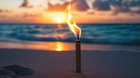 A glowing torch stands on the sandy beach, capturing the warmth of the sunset. The vibrant flame contrasts beautifully with the serene ocean waves and colorful sky.