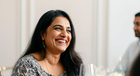 Happy woman with long black hair is smiling at a social event, surrounded by elegant table decor and soft lighting, creating a warm and inviting ambiance, AI generated