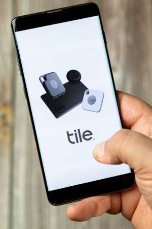 02-24-2021 Portsmouth, Hampshire, UK A mobile phone or cell phone being held by a hand with the Tile app open on screen