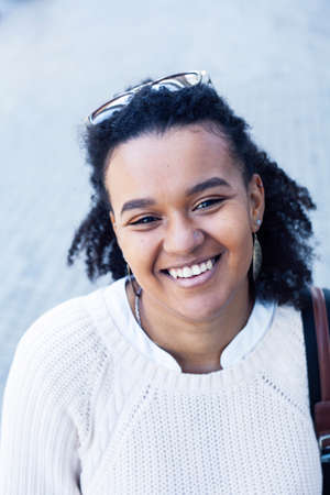 A woman displays a genuine smile while enjoying the outdoors. Sunlight illuminates her face highlighting her joyful expression. She appears relaxed and carefree exuding happiness.