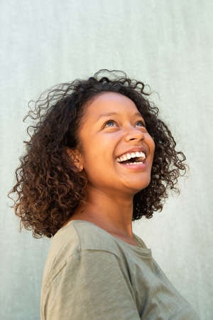 Happy attractive curly young African American woman in casual wear looking in distance, daydreaming, planning future or visualizing future standing in modern home office, inspiration concept.