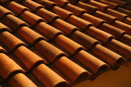 Classic terracotta roof tiles arranged in an overlapping pattern, illuminated by bright sunlight, creating a warm, textured surface. ideal for architectural, construction, or traditional design themes.