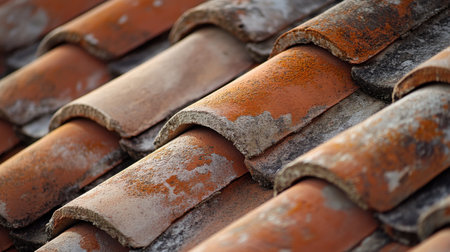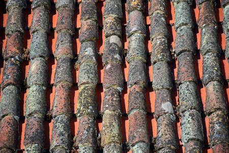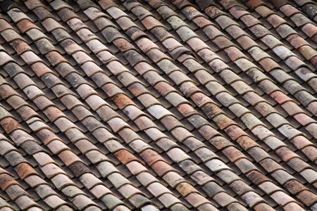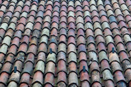 Weathered clay roof tiles on an old house.