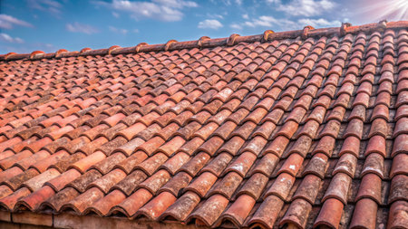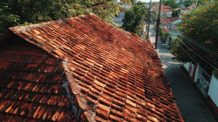 An overhead view reveals a detailed terracotta tiled roof, exhibiting a weathered texture. The warm, earthy tones of the tiles contrast with a blurred background suggesting a residential area. The shot is captured in daylight with natural illumination, and could be utilized for various commercial and illustrative purposes.