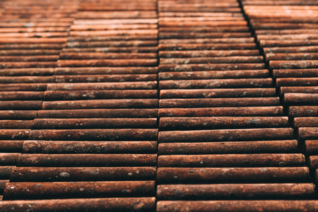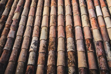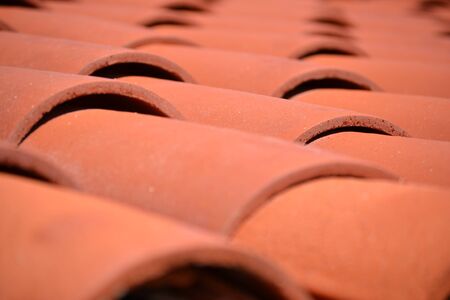 Close up of orange dirty ceramic roof tiles