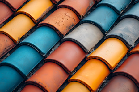 A vibrant arrangement of multicolored terracotta roof tiles displaying durable construction material. the alternating colors, including red, orange, blue, and yellow, create an eye-catching pattern ideal for architectural design. Generative AI