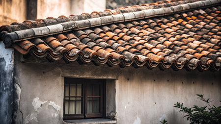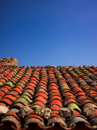Traditional old Spanish ceramic roof tiles on a building, characteristic elements of Mediterranean architecture, vintage