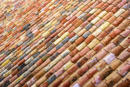 isolated close-up fragment of multi colored tiled roof in the sunlight