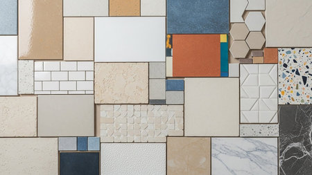 A diverse collection of tile samples showcasing various textures, colors, and patterns arranged in a collage.