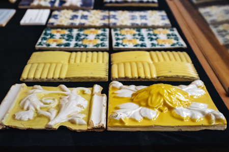 Colorful ceramic tiles in a shop in Lisbon, Portugal. Selective focus