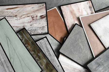 Ceramic tile samples in a shop, close-up.