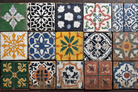 Colorful vintage tiles with intricate patterns on wooden surface. Traditional decor pieces feature floral and geometric designs, ideal for home styling.