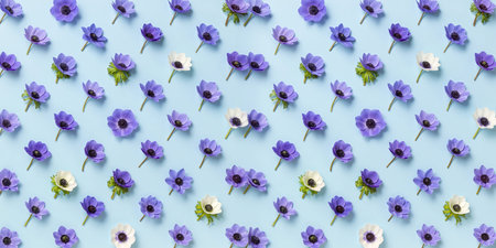 Colorful anemone flowers scatter across a calm blue surface, creating joy.