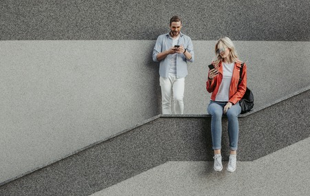 Modern life communication. Woman sitting on apron and typing on handy. Man leaning against grey wall going the same. Copy space on left side