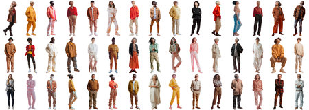 Many people set on isolated background, casual fashion wear, full body length shot, mixed different diversed people, trendy summer collage of happy positive male and female, crisp edges style