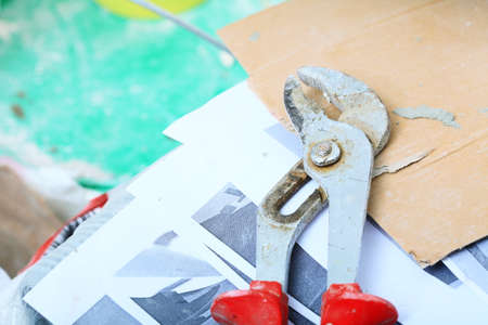 Close-up of an old and rusty gripper or pliers over wooden table. High quality photo