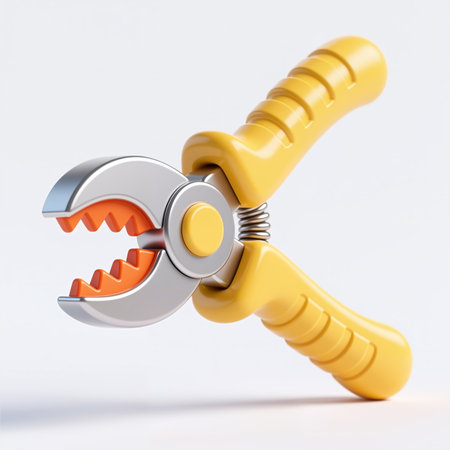 Pliers with yellow handles and spring-loaded metal gripping surface set against a plain white background, rendered in a detailed and glossy visual style.