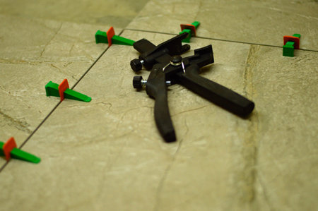 The craftsman presses the ceramic tile into the adhesive bed, engaging the plastic clips and wedges of the leveling system to prevent any lippage between tiles.