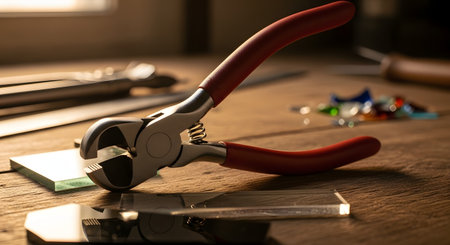 A close-up of a pair of glass cutting nippers or pliers with red handles, resting on a wooden workbench. Pieces of cut stained glass and other crafting tools are visible in the background, suggesting a stained glass or mosaic art workshop.