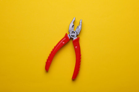 A seamless, repetitive instrumental pattern. Modern, new pliers with bright yellow, red rubber handles on a white background. The concept of repair, home tool.