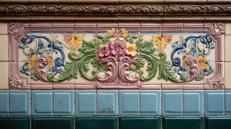 This beautiful vintage tile art piece showcases intricate floral motifs and ornate designs, enhancing any space with a rich blend of colors and textures.