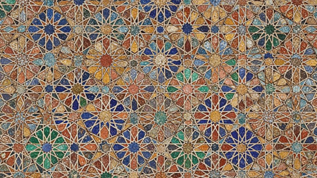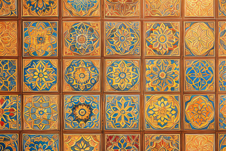 Exotic Moroccan tile background with intricate patterns, vibrant colors, and textured ceramic surfaces. The rich, cultural design adds an element of exotic beauty and craftsmanship to any scene