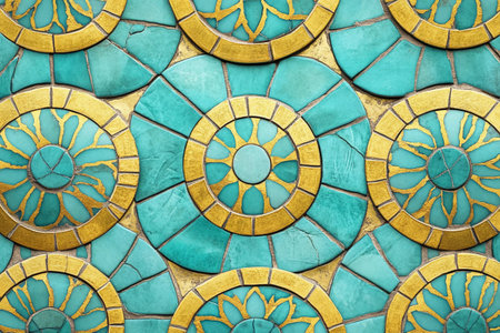 A detailed view of a mosaic tile wall showcasing intricate patterns and vibrant colors, A mosaic of tiles in an Islamic art display, AI Generated