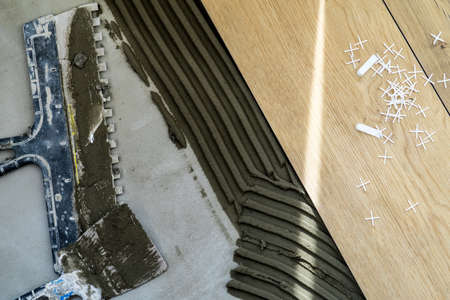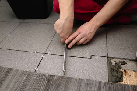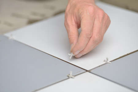 A worker installs a tile leveling system. Crosses for ceramic tiles. The tile is installing plastic crosses in the seams of ceramic tiles. The master sets the crosses between the tiles.